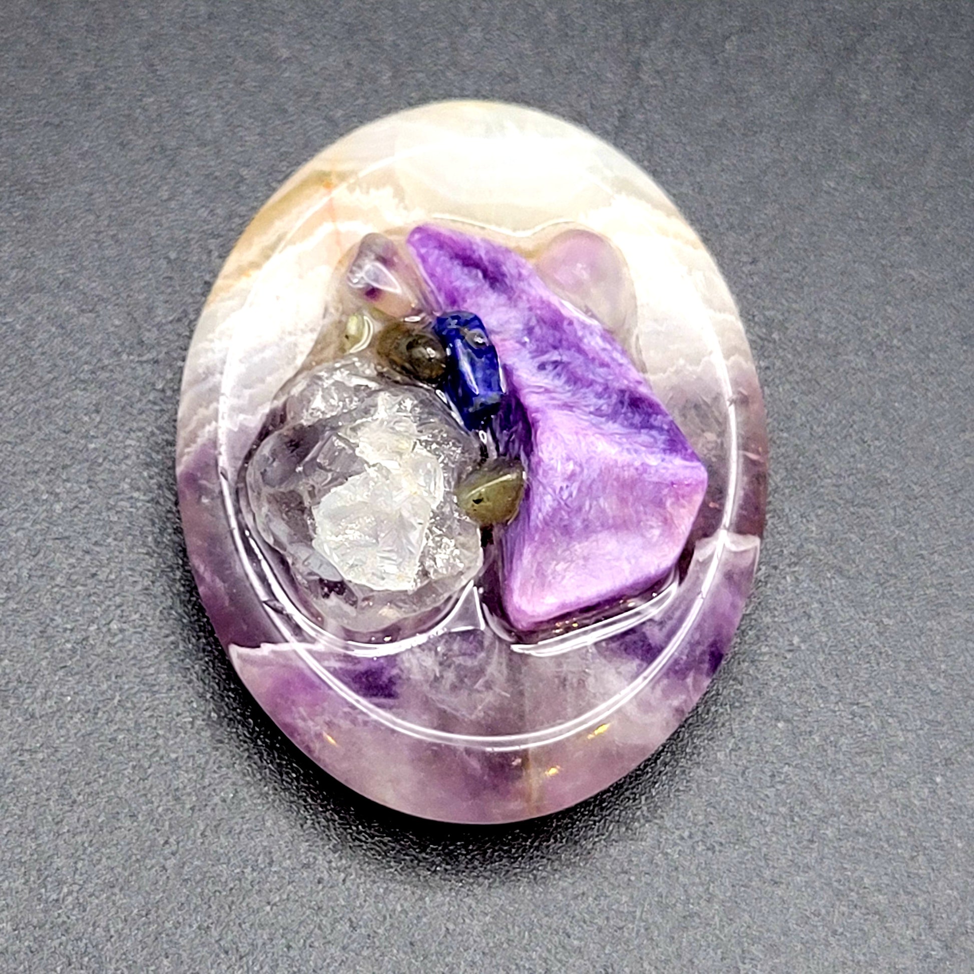 Amethyst worry stone holding 6 different crystals to rest on your third eye as you meditate! VERY POWERFUL!