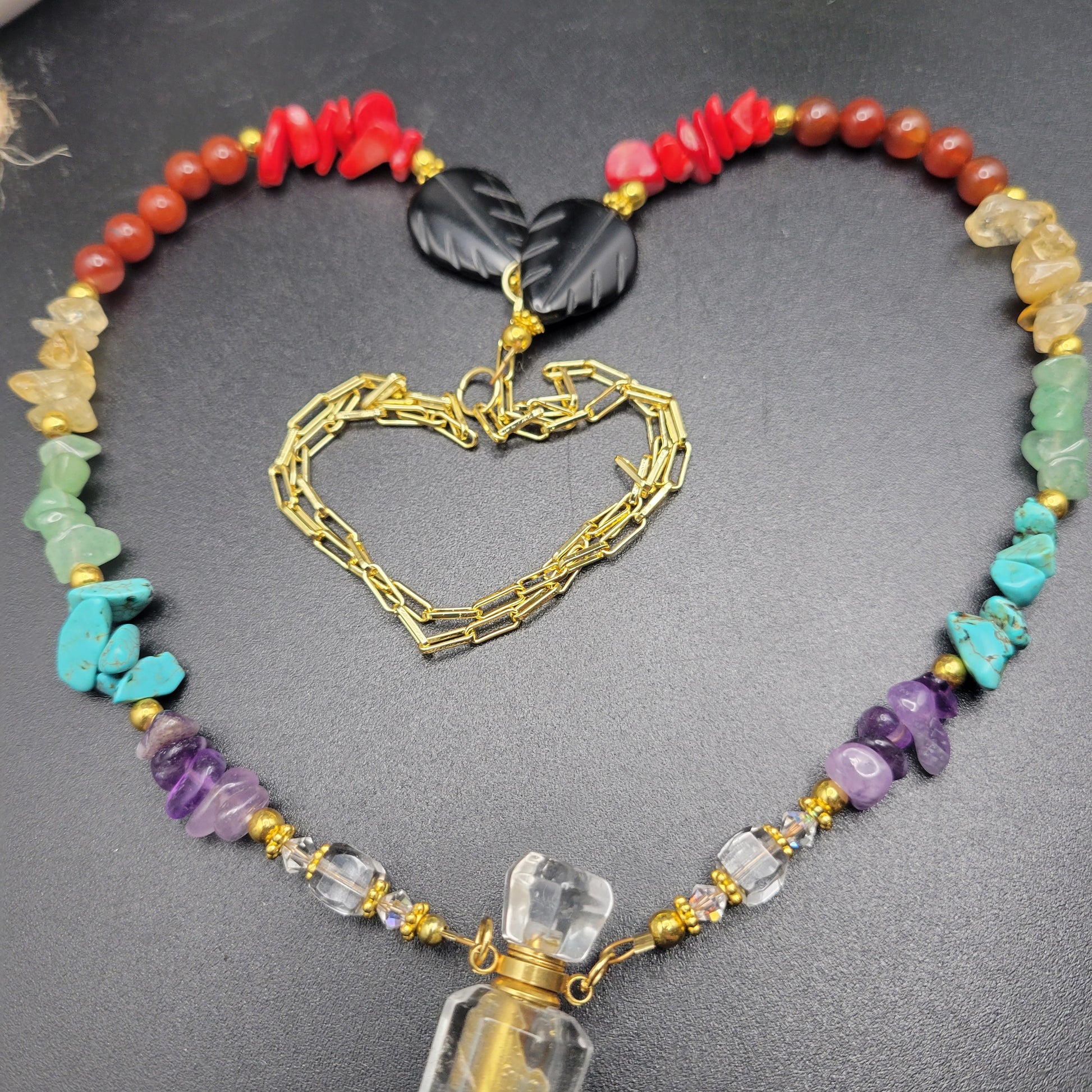 Item: Chakra 32' necklace. Quartz crystal, Amethyst, Sodalite, Green Aventurine, Citrine, Carnelian, Red Jasper, Black Onyx leaves for the earth star chakra!