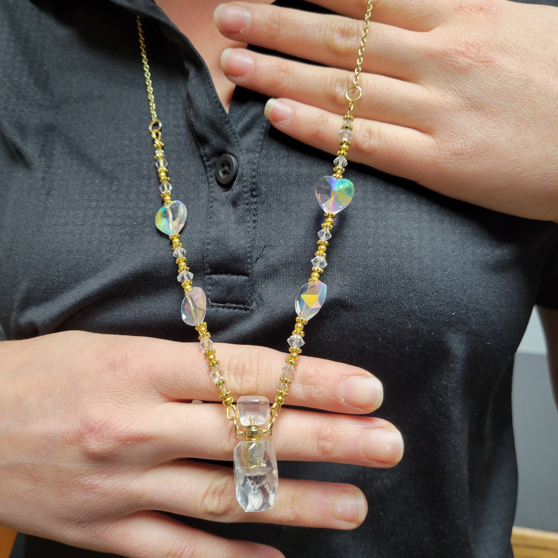 Clear Crystal Quartz Essential oil bottle necklace with Heart Quartz beads