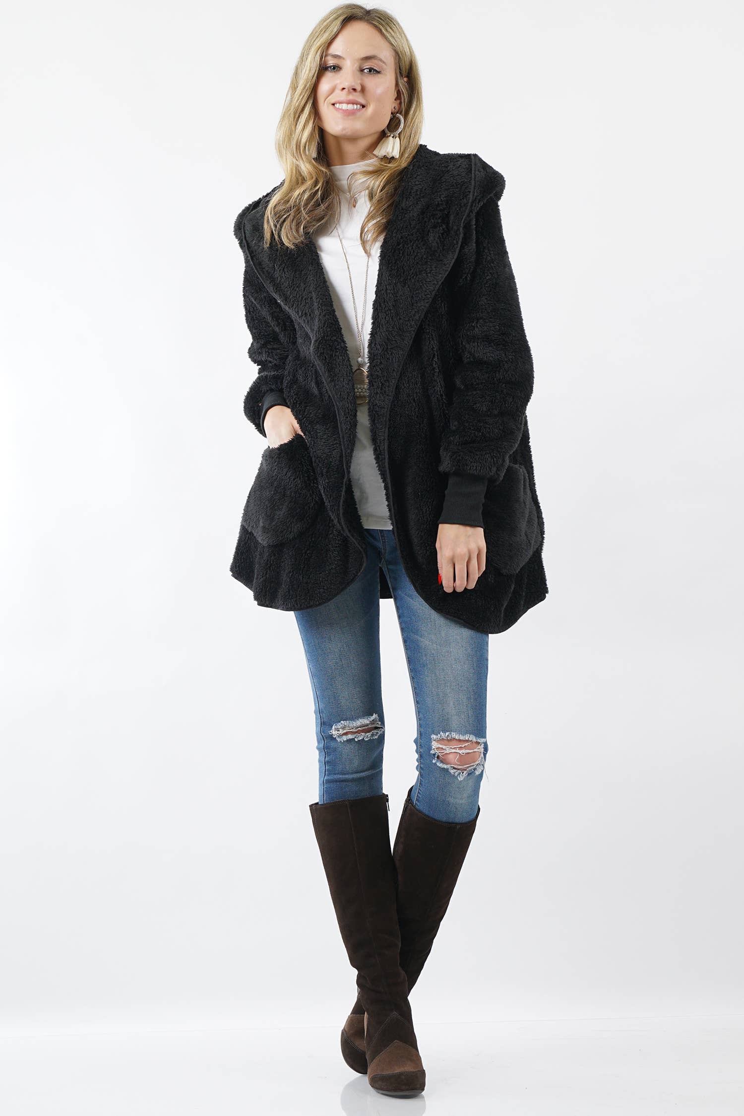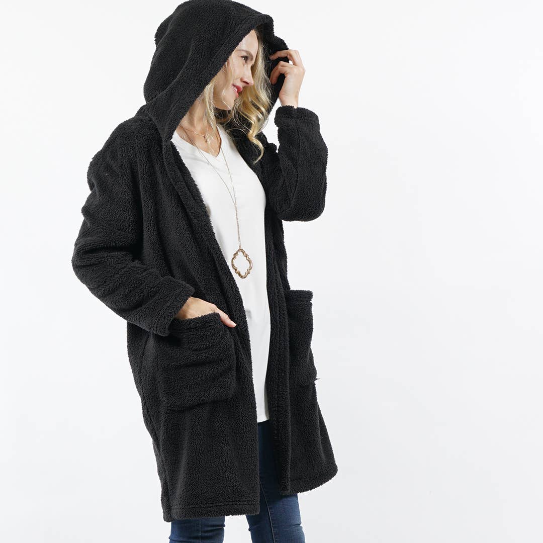 SI-15152 Faux Fur Hooded Open Front Coat (95% Polyester, 5% Spandex)