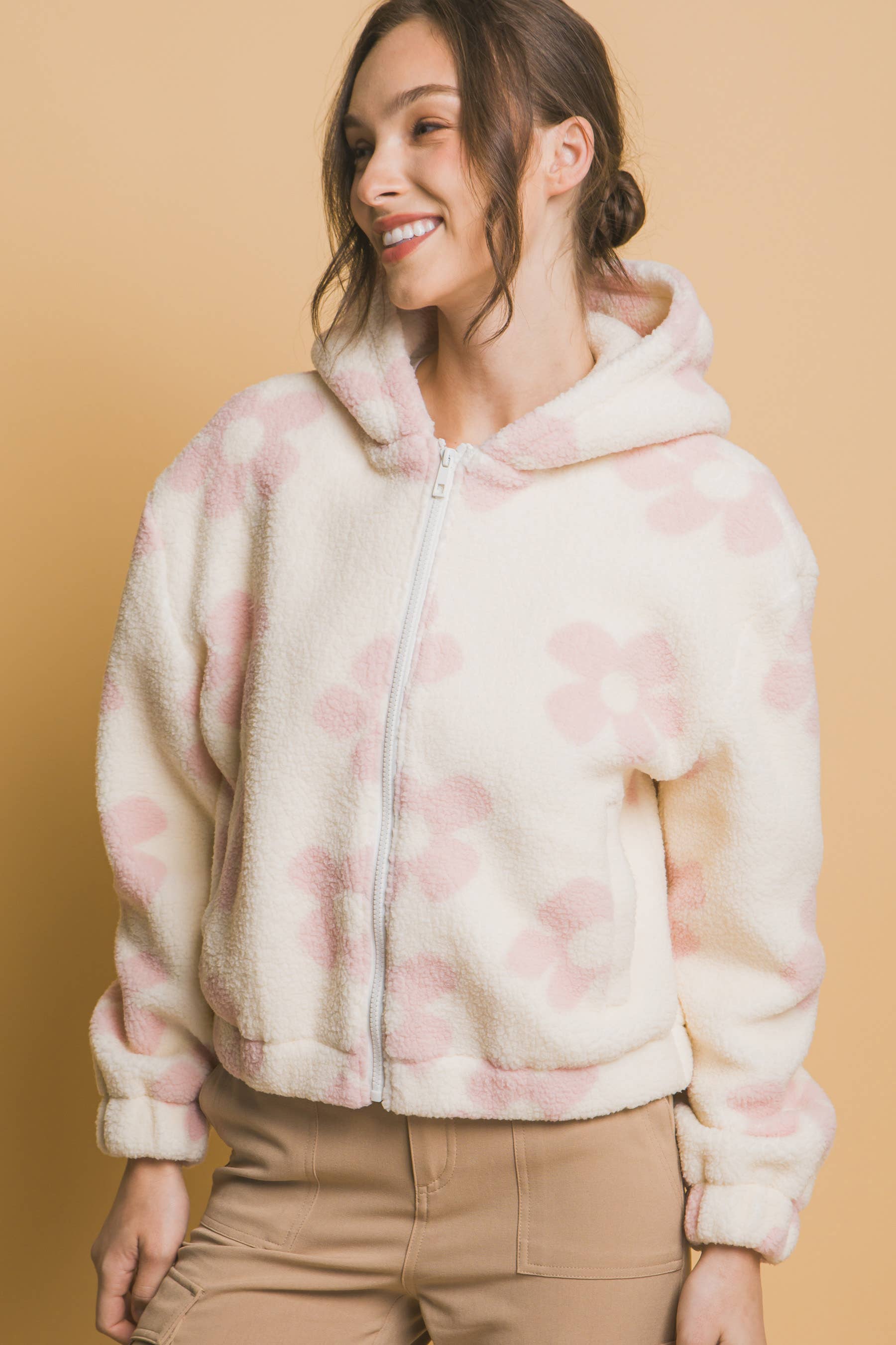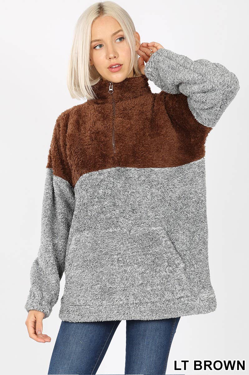 SI-15438 Contrast Two Tone Faux Fur Zip Up Kangaroo Pockets (100% POLYESTER)