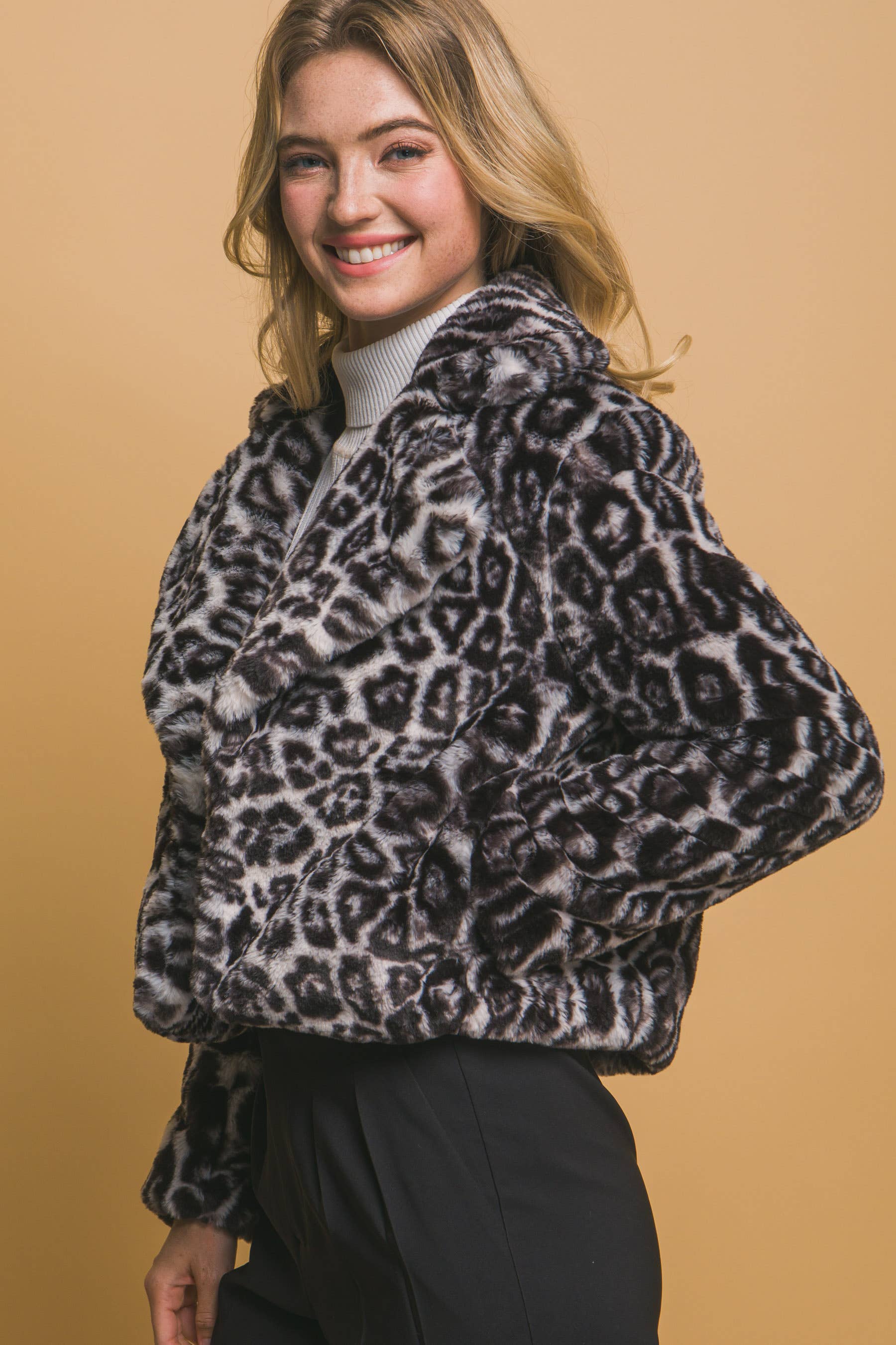 SI-26975 Leopard Print Faux Fur Jacket (100% POLYESTER)