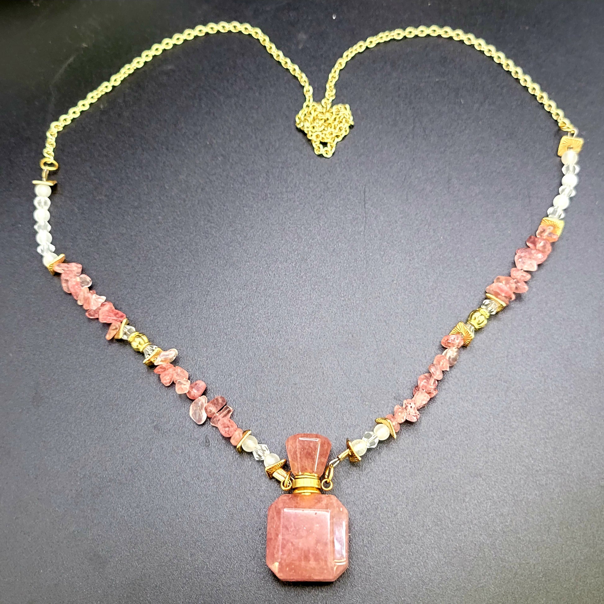 Item: 25' Strawberry quartz & Selenite essential oil bottle necklace